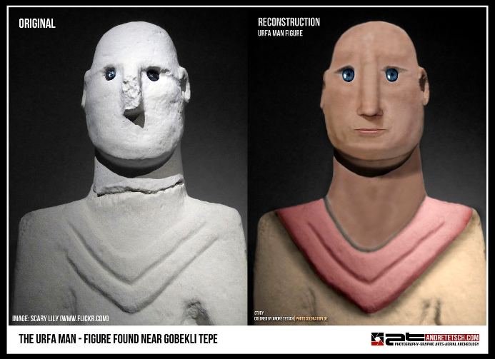 Auch gefunden wurde in der Nähe eine menschlich aussehende Figur…der sogenannte „Urfa-Mann“. Man rätselt, ob es sich um eine „primitive“ Kunstarbeit aus dieser Zeit handelt als Darstellung der damaligen Menschen, einer Gottheit, einem Wesen, das tatsächlich so „komisch“ aussah und nicht „von dieser Welt“ ist. Ich habe nun versucht, dem Urfa-Mann ein Gesicht zu geben…und er sieht wirklich seltsam aus…anatomisch. Ein echter Mensch…oder ein Gott aus Fleisch und Blut eines von alten Kulturen so bezeichteten "Sternenvolkes" ? Man weiß es nicht…