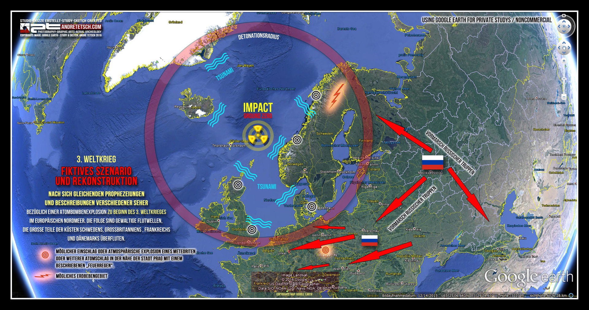 15. Jahrhundert an bis in die 1960er Jahre und heute den wohl "unvermeidbaren" 3. Weltkrieg vorausgesehen...und das erstaunlich (erschreckend) detailliert und übereinstimmend. Er soll vermutlich zwischen Juni und August 2017 ausbrechen. Es wurden schon viele Skizzen und Szenarien weltweit grafisch gefertigt. Jetzt habe ich die "gesehenen" Prophezeiungen auch mal ohne Wertung auf Wahrheit versucht, grafisch umzusetzen. Es sieht nicht sehr gut und "freundlich" aus...aber es ist nur eine fiktive Grafik und hoffen, dass sich alle Seher irren oder die Menschheit vernünftig wird und das alles abwenden kann!