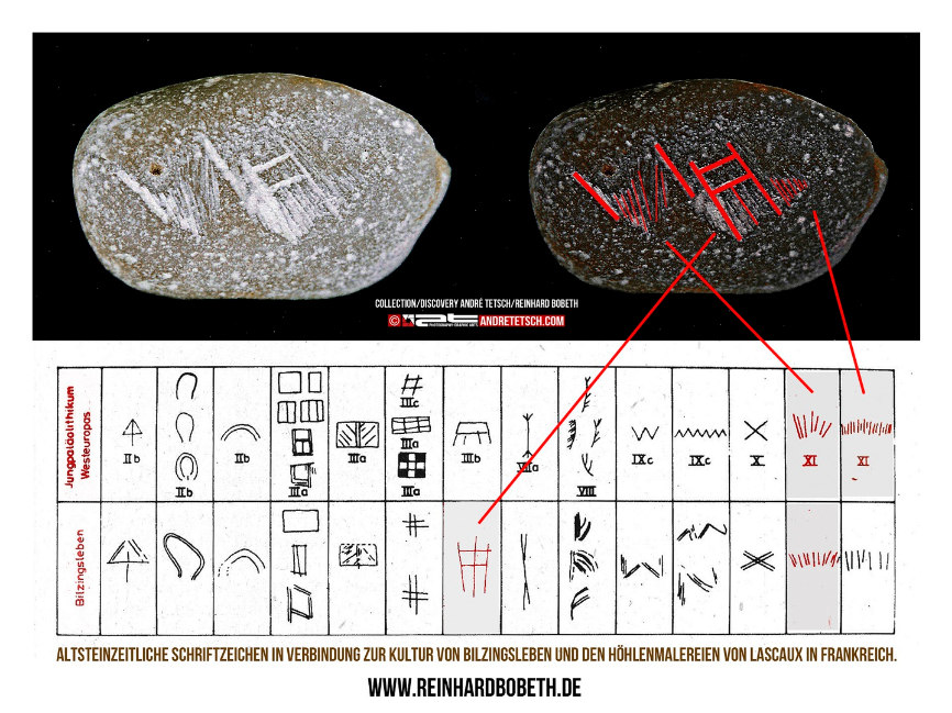 Mein Vater und ich entdeckten vor ca. 28 Jahren eine fossile, verkieselte Koralle in einer Kiesgrube nahe unserem Haus. Darauf waren ungewöhnlich, künstlich anmutende Einritzungen. Nun...jeder normale Mensch sah, dass diese Ritzspuren ungewöhnlich und vorzeitlich sein müssen. Aber ausgerechnet sogenannte "Fachleute" und "seriöse Archäologen" vom Landesmuseum für Ur- und Frühgeschichte in Halle/Saale meinten, dass dieses "Zufall" sei...ein Archäologe meinte sogar "frech", dass wir diese Ritzspuren selbst erstellt hatten! Nun...jeder vermeintliche "Idiot" und "Spinner" sieht mit einer Lupe, dass die Furchen/Rillen mit kleinen, verkieselten Elementen/Kristallen versehen sind, die nur aufzeigen, dass die Ritzungen bereits vor sehr langer Zeit erstellt wurden!! Das Artefakt lag ca. 15m unter dem Grundwasserspiegel...überzogen mit tonnenschwerem Geschiebe der letzten Eiszeit. Diese Schriftzeichen ähneln extrem denen, die in Bilzingsleben in Sachsen-Anhalt gefunden wurden...so auch denen in den Höhlen von Lascaux in Frankreich. Es könnte eben eine Verbindung zwischen den Menschen/Kulturen in der Altmark, Bilzingsleben und Lascaux hergestellt werden.