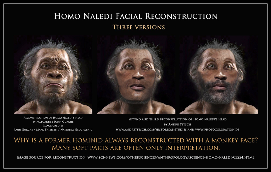 Gestern sah ich eine interessante Doku über die vermutliche Evolution des Menschen über einen langen Zeitraum, was nicht nur ich inzwischen als falsch empfinde. Es ging auch um einen Hominiden, der anthropologisch aus der Reihe tanzt…der Homo Nalepi. Von diesem wurden nur Schädelteile gefunden, wobei der vordere Gesichtsbereich (Nase, Jochbeine) fehlten.