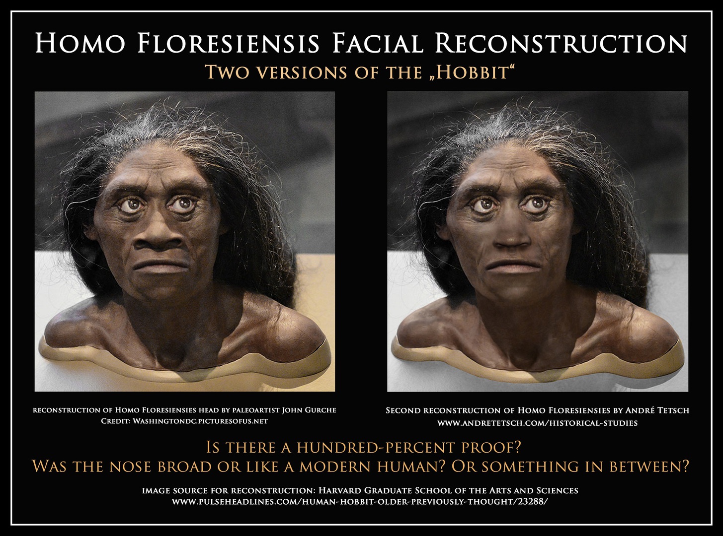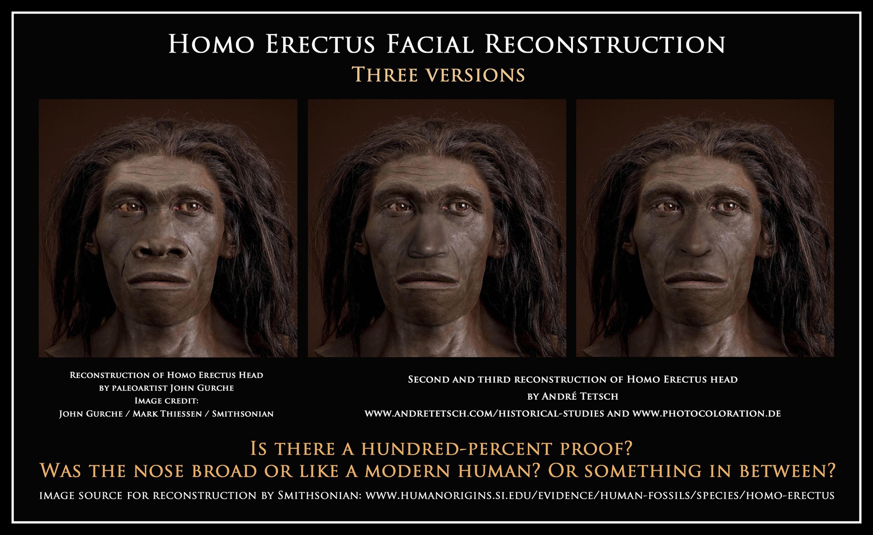 Also wird dem Schädel bei der Gesichtsrekonstruktion erstmal ein „Affengesicht“ verpasst mit breiten Nasenflügeln etc., weil ein früher Hominide ja mehr ein Affe sein müsste. Aber das sehe ich als eine Art Voreingenommenheit! Die Form und Länge der Nase ist vermutlich auch wieder eher Raten. Warum also können z.B. der Homo Nalepi und andere Hominiden trotz primatenartigem Skelettaufbau nicht Gesichtszüge eines modernen Homo Sapiens haben, z.B. eine „normale Nase“ und Lippen/Mundform?? Zum Glück hat man das bei der Rekonstruktion von Schädeln des durchaus intelligenten Neandertalers inzwischen berücksichtigt und korrigiert. Sicher bleibt bei noch primatenartigen Hominiden der vorgezogene Kiefer, der trotzdem nicht zwangsweise schmale Lippen wie ein Schimpanse haben muss.