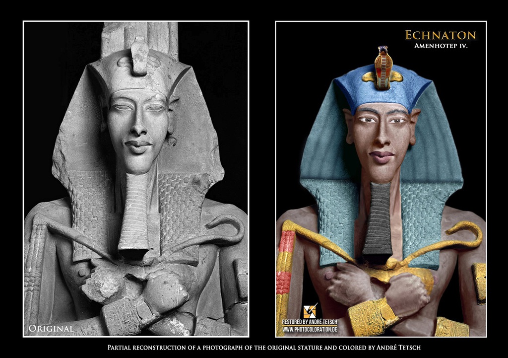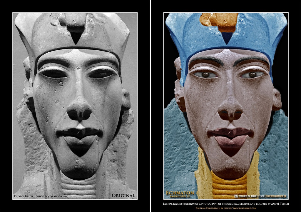 Kolorierte Gesichtsrekonstruktionen von Büsten/Gesichtern des Pharao Echnaton, Kaiser Cäsar, Marc Aurel, Nero und anderen.